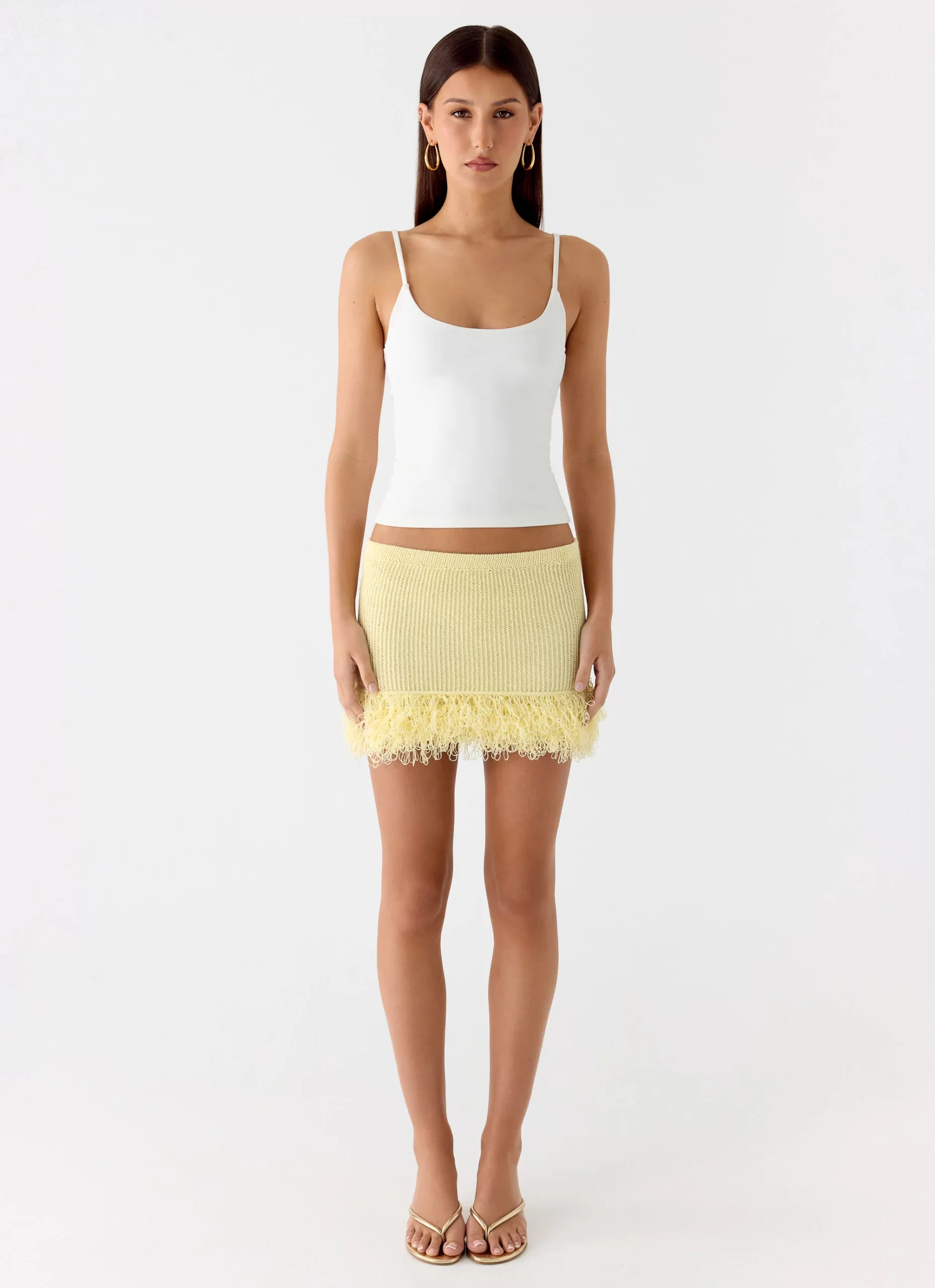 The Elyssa Knit Mini Skirt is a playful, on-trend piece for effortless day-to-night styling. Crafted in a soft knit with fringe trimming, this mini skirt sits comfortably at the waist for a flattering silhouette.