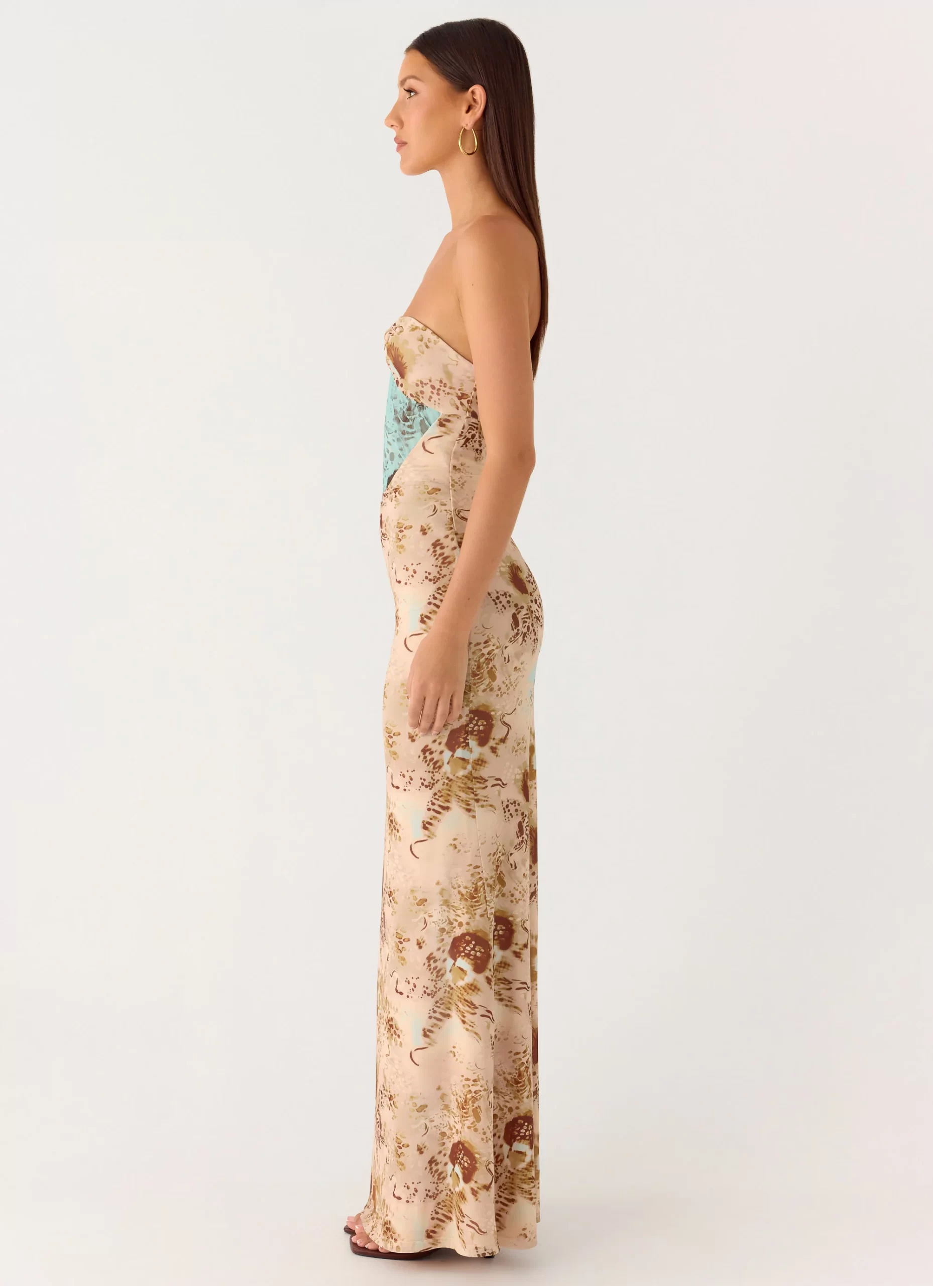 The React Strapless Maxi Dress is a stunning maxi dress designed with a strapless neckline, stretch mesh, and an asymmetrical waist. Fully lined with gripper tape for secure wear, it features an exclusive print, perfect for standout occasions.