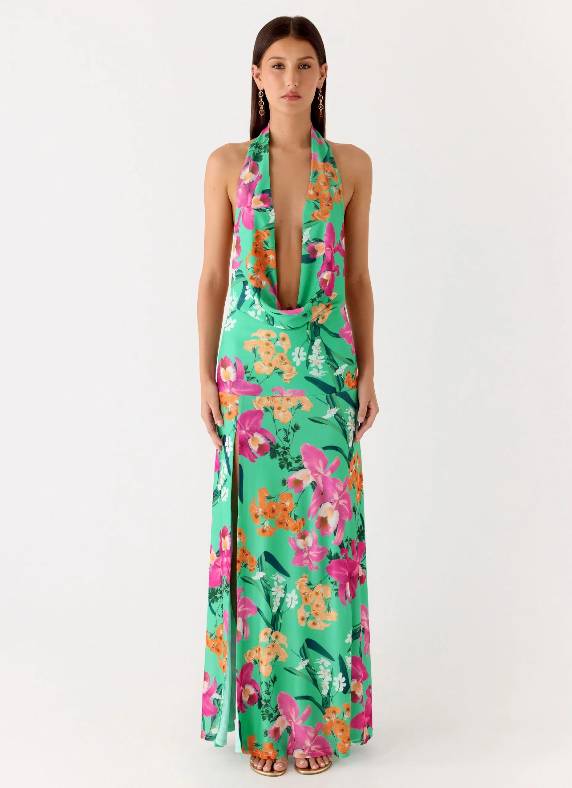 The Zoriana Maxi Dress is a chic and versatile piece, featuring a low cowl halter neckline, stretch mesh fabric, and a low back for effortless elegance.